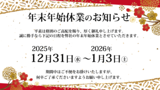 日頃より当店をご利用いただきありがとうございます。今年も残すところあと僅かですが、いかがお過ごしでしょうか。誠に勝手ながら、下記の期間を年末年始の休業とさせていただきます。 ご迷惑をおかけいたしますが、何卒ご理解いただきますようお願い申し...